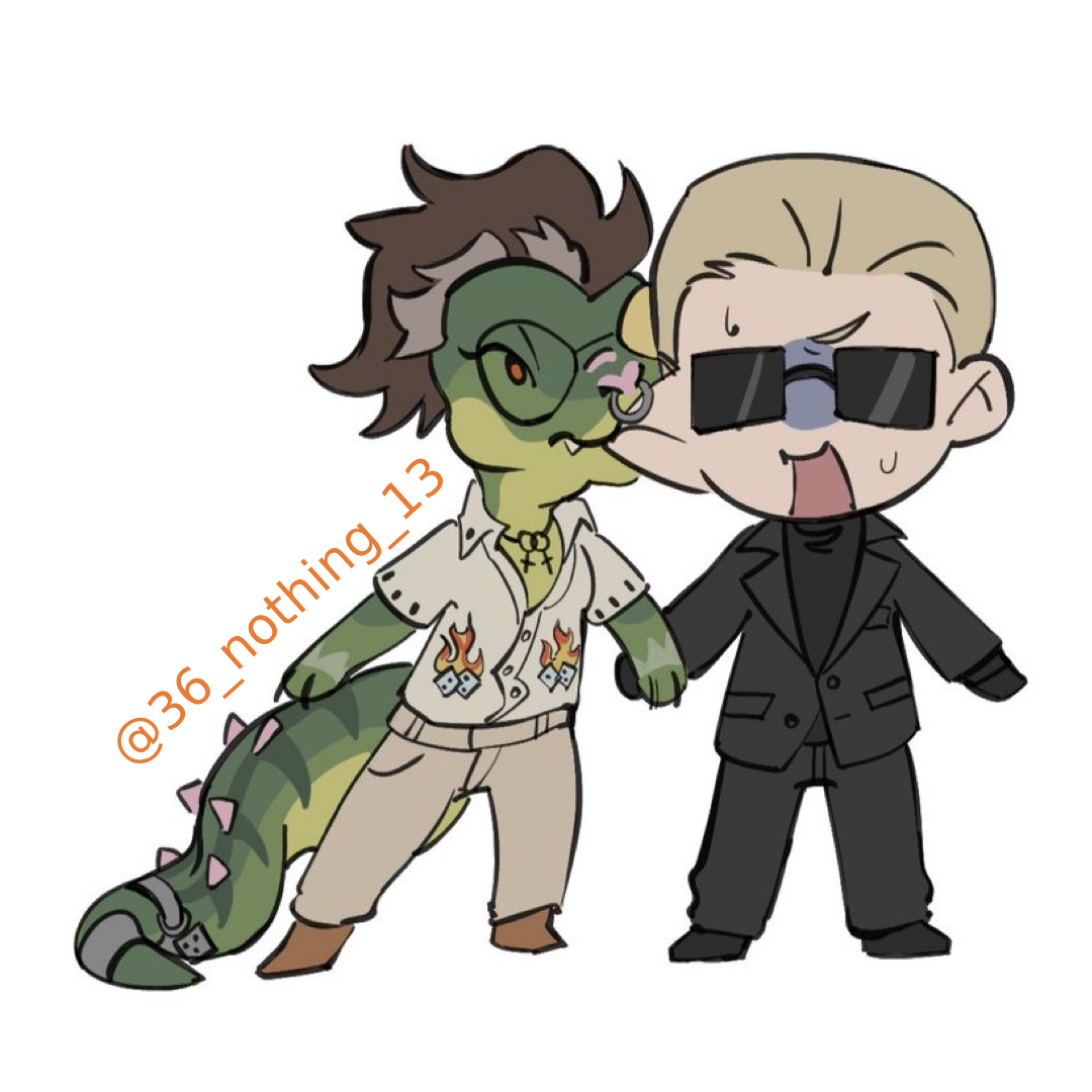 a blue-collar croc like him doesn't get much time off, but when he does, he fancies his girlfriend's good cooking (or some greasy fast food!), a nap in the sun, and a swim! he likes breaking a sweat and going on long drives, and sleeps with a teddy bear named albeart. he loves to cuddle... he's always cold! his pug named chickpea is his whole world, and he spoils her often!